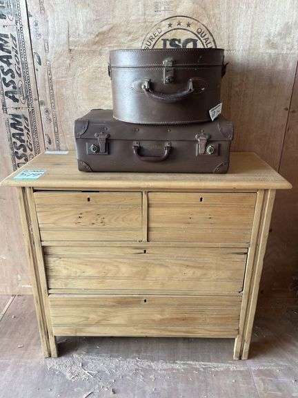 LOT 519 - Timber Drawer Unit, Antique Leather Hat Box & Suitcase