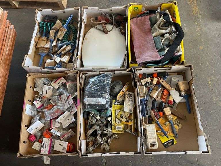 LOT 601 - Pallet Assorted Sundries inc Hinges, Paint Brushes, Clipsal Fittings and Power Lead