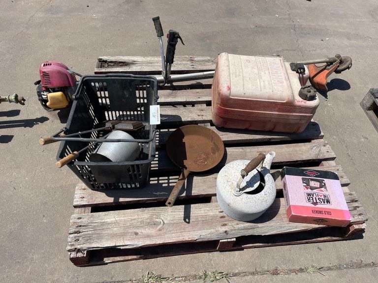 LOT 408 - Pallet Camping Accessories, Fuel Can and Whipper Snipper