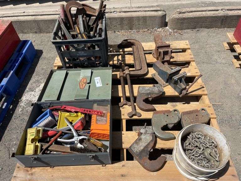 LOT 762 - Pallet Clamps, Lifting Chain, Vice and Tools