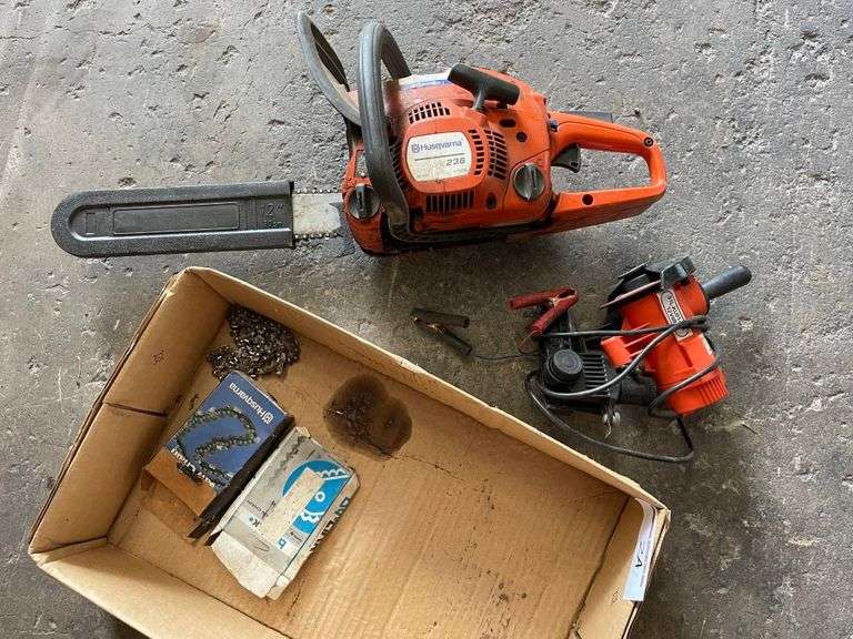 LOT 511 - Husqvarna Chainsaw, 12v Sharpener and Chains