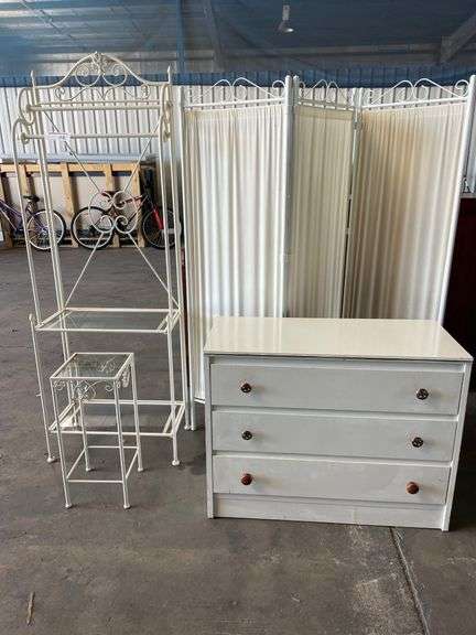 LOT 627 - White Drawers 900x700mmH, Iron Work Table, Privacy Screen and Bat Wing Boots