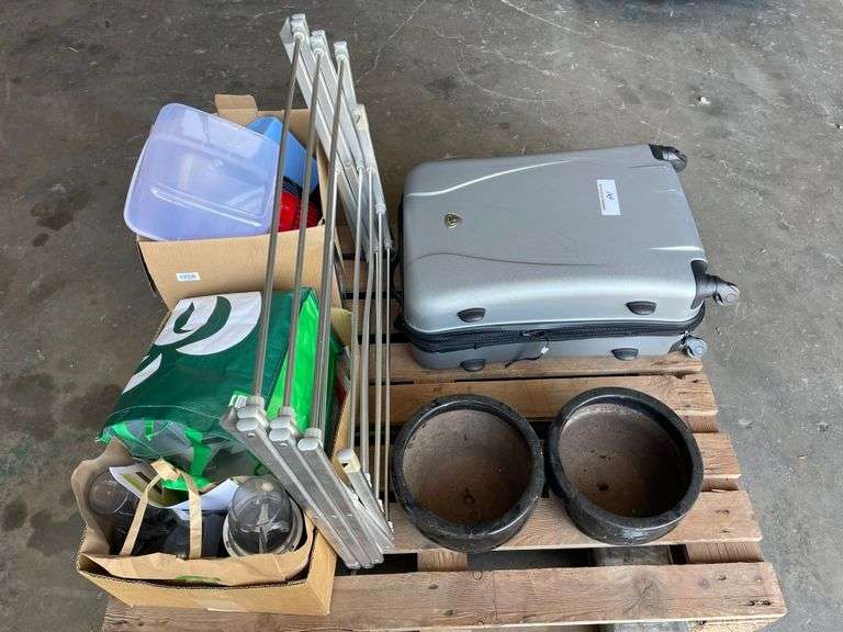 LOT 695 - Pallet inc Suitcase, Pots, Line, Nutribullet and Containers
